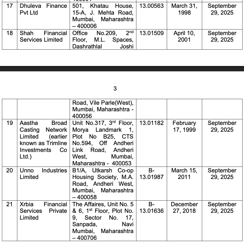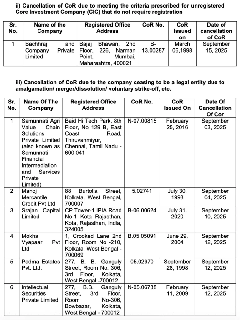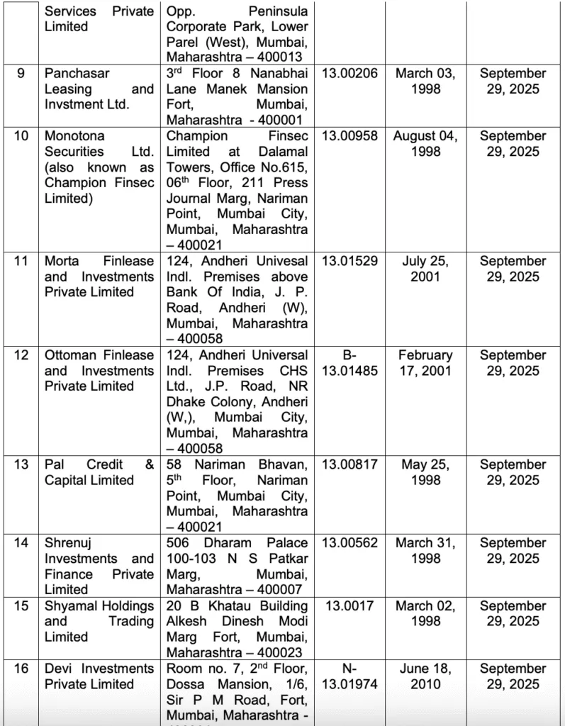 RBI cancelled License of Following NBFCs