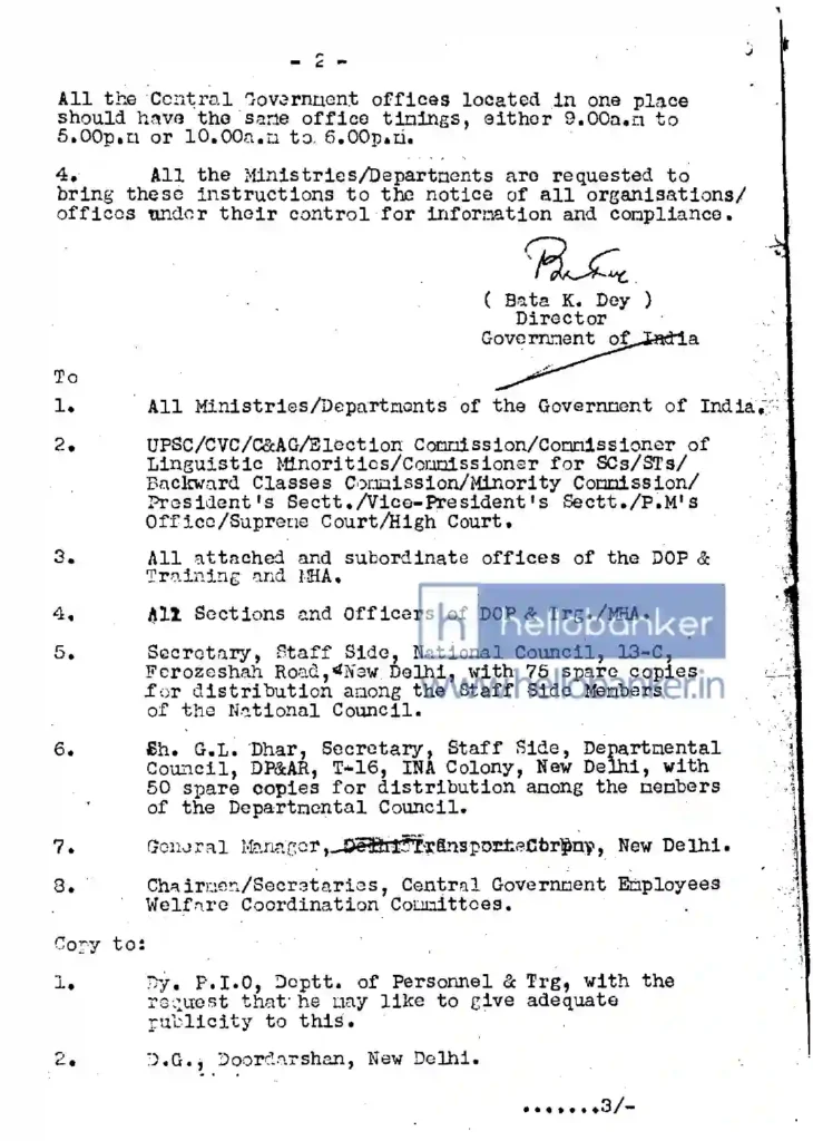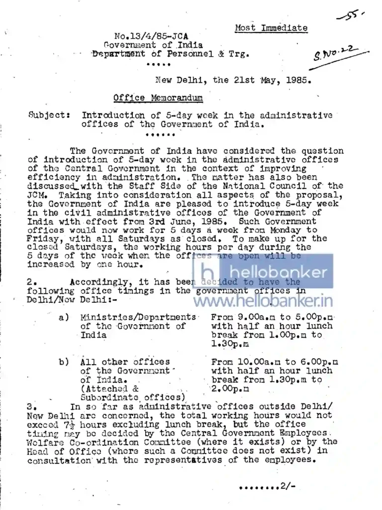 The Government of India has considered the question of introducing a 5-day week in the administrative offices of the Central Government in the context of improving efficiency in administration. The matter was also discussed with the Staff Side of the National Council of the JCM. After considering all aspects of the proposal, the Government of India is pleased to introduce a 5-day working week in the civil administrative offices of the Government of India with effect from 3rd June, 1985. Accordingly, Government offices will work five days a week from Monday to Friday, and all Saturdays will be closed. To compensate for the closed Saturdays, the daily working hours on the five working days will be increased by one hour.