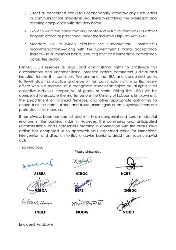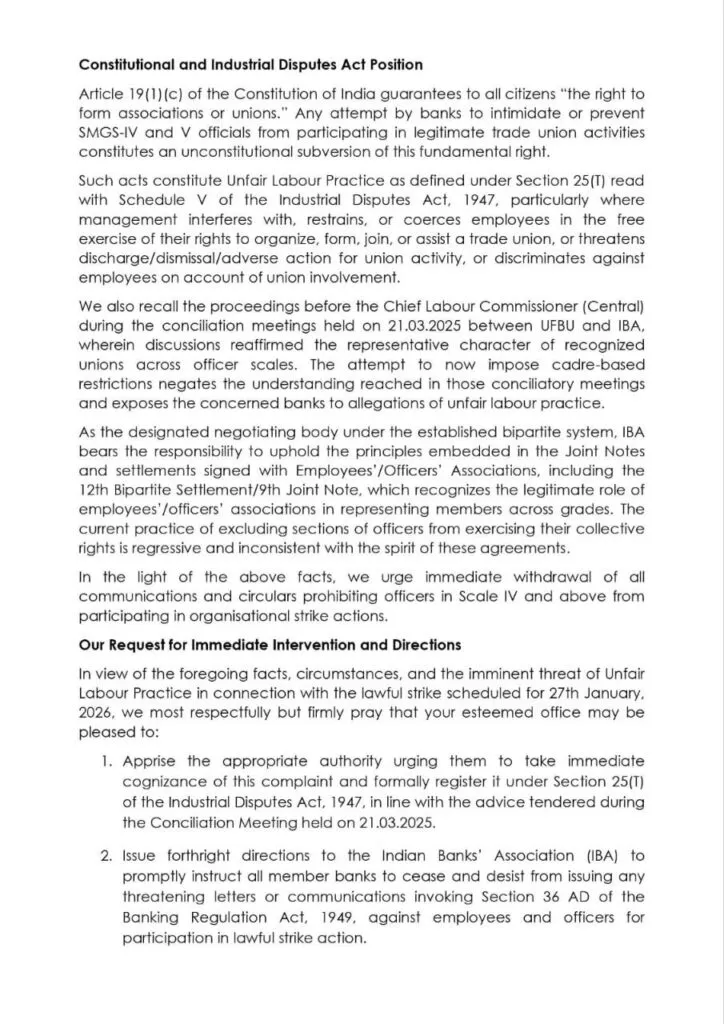 Now, UFBU has now formally approached the labour authorities. UFBU has urged authorities to issue directions to the Indian Banks’ Association (IBA) and banks to stop such unlawful practices, withdraw any threatening letters already issued, and ensure that no officer is discriminated against for participating in collective union activities.