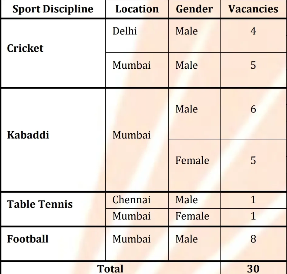 | Clerk (Sports Quota) | 30 (Male-24, Female-06) |