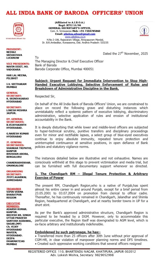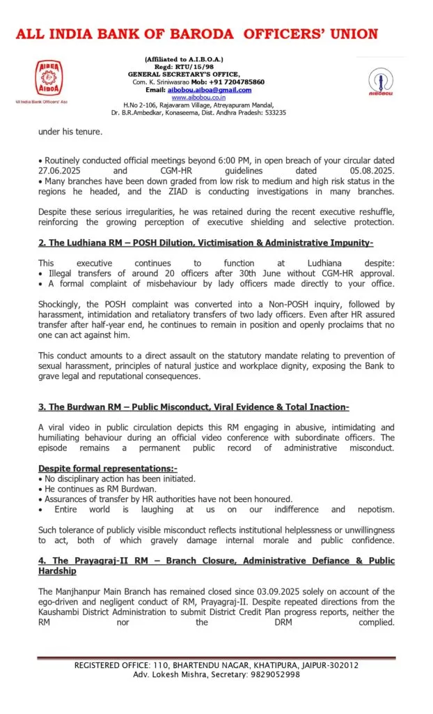 Some big allegations have been raised against the top management of Bank of Baroda. All India Bank of Baroda Officers’ Union has raised some serious allegations against the Regional Managers of Bank of Baroda. If these allegations are true, then Bank of Baroda must conduct an impartial enquiry and take strong action. AIBOBOU has highlighted multiple cases where Regional Managers allegedly abused authority, violated transfer policies, harassed staff, ignored administrative instructions, mishandled POSH complaints, and caused operational disruptions, including branch closure. One female staff was sexually harassed, but her complaint was not heard. Let’s have a look at the allegations one by one.