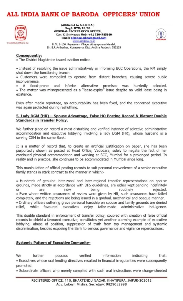 AIBOBOU stated that it recorded a verified instance of selective administrative accommodation involving a lady DGM (HR), whose husband is a CGM in the same Bank. She has been shown on paper as posted at Head Office, Vadodara, only to conceal her continued working and accommodation at BCC, Mumbai. In reality, she continues to operate from Mumbai. This manipulation of posting records stands in contrast to the way genuine inter-zonal and inter-regional transfer requests on spouse grounds, made strictly per DFS guidelines, are either kept pending indefinitely or are routinely rejected.
