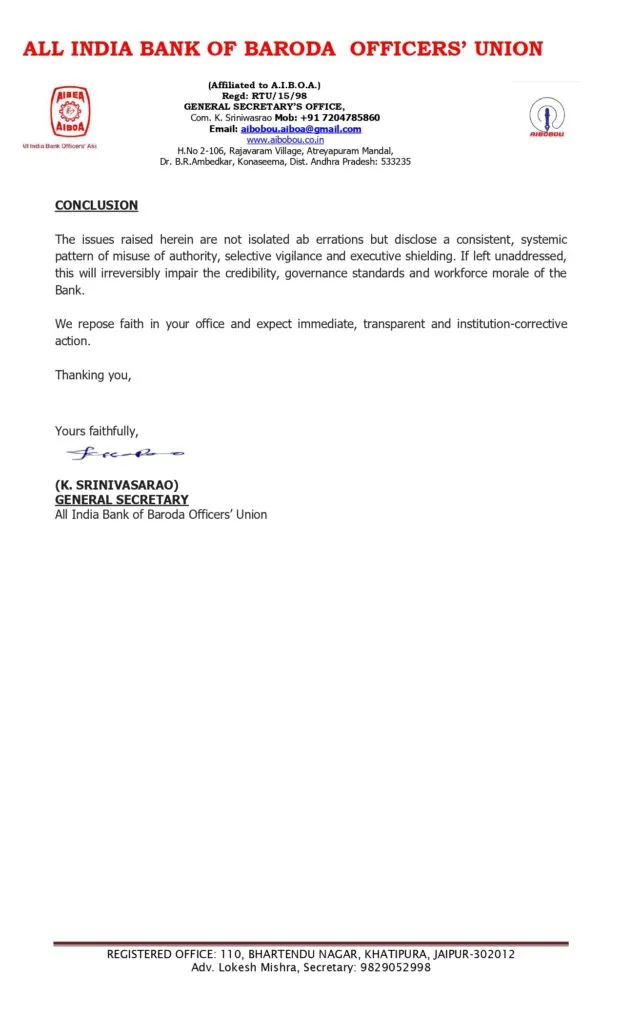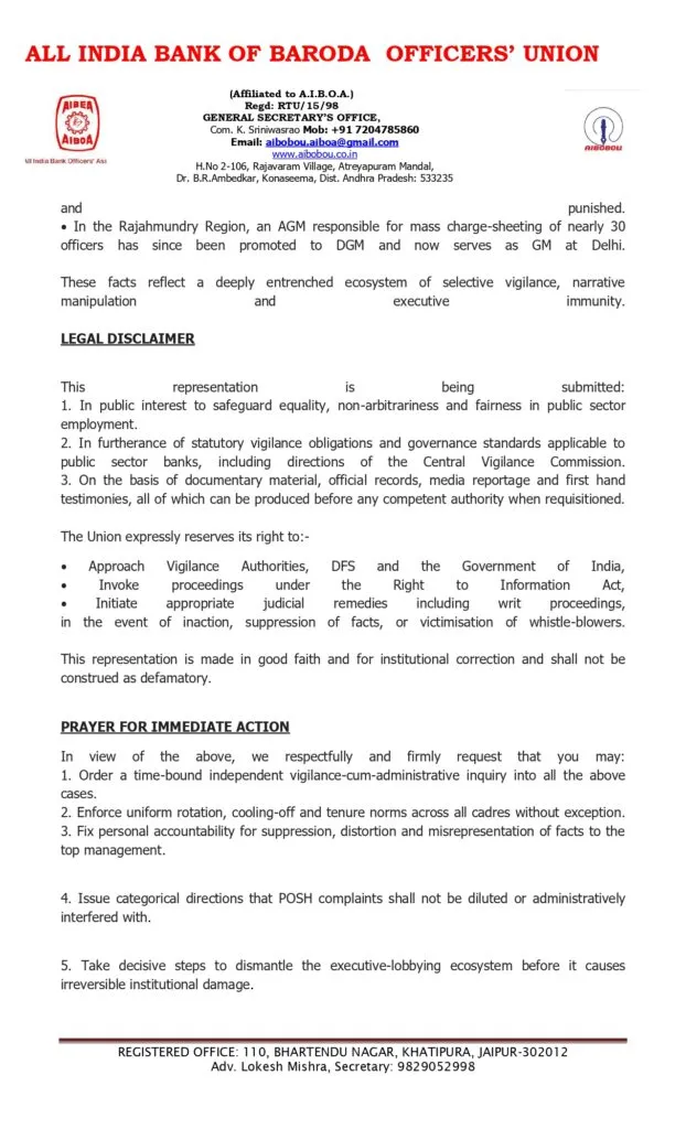 AIBOBOU stated that the letter is based on documentary material, official records, media reports and first-hand testimonies, all of which can be shown to any competent authority. The Union reserves its rights to approach vigilance authorities, DFS and the Government of India, invoke the Right to Information Act and initiate judicial remedies including writ proceedings in case of inaction, suppression of facts, or victimisation of whistle-blowers. This representation is made in good faith and for institutional correction, and shall not be construed as defamatory.