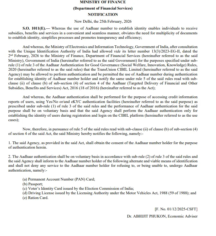 The Ministry of Finance (Department of Financial Services) has issued an official notification allowing TransUnion CIBIL Limited to use Aadhaar authentication for verifying the identity of users.