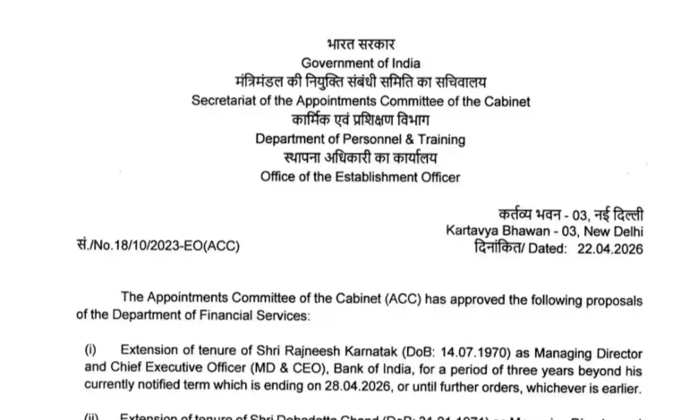 Govt has extended tenure of Shri Rajneesh Karnatak (DoB: 14.07.1970) as Managing Director and Chief Executive Officer (MD & CEO), Bank of India, for a period of three years beyond his currently notified term which is ending on 28.04.2026, or until further orders, whichever is earlier.