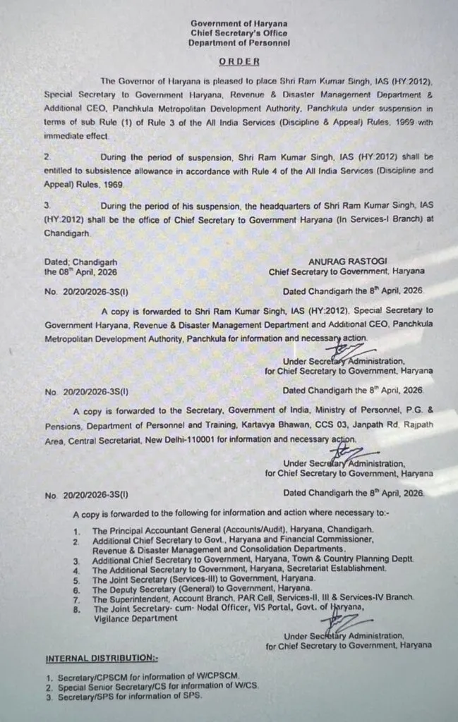 Ram Kumar Singh, an IAS officer of the 2012 batch, has been suspended with immediate effect. He was working as Additional CEO of the Panchkula Metropolitan Development Authority and also held charge in the Revenue and Disaster Management Department.