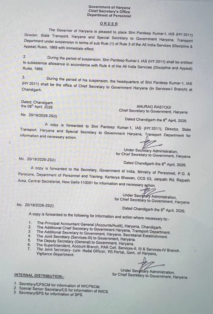 In a separate order, Pardeep Kumar-1, an IAS officer of the 2011 batch, has also been suspended. He was serving as Director of State Transport and Special Secretary in the Transport Department.