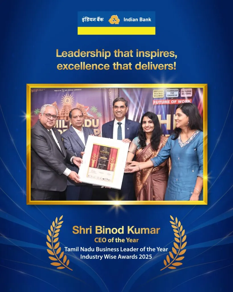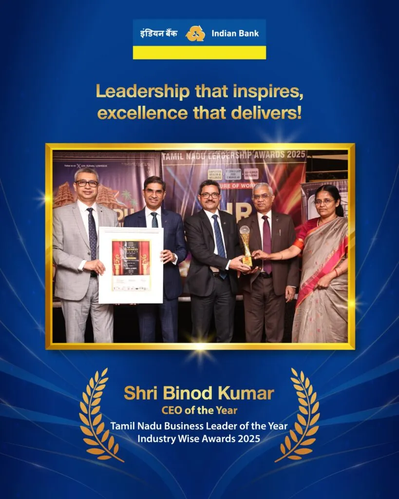 Indian Bank Managing Director and CEO, Shri Binod Kumar, has been honoured with the title of ‘CEO of the Year’ at the Tamil Nadu Business Leader of the Year – Industry Wise Awards 2025. The award ceremony took place on 5 December 2025 at Taj Club House in Chennai.
