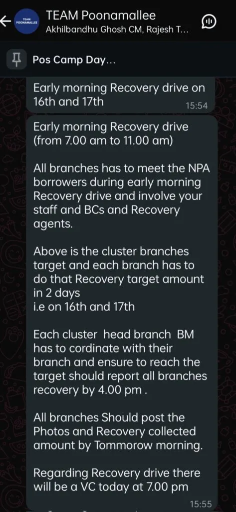 Indian Bank employees have been directed to take part in an early morning recovery drive on October 16 and 17. The instruction was issued in the Poonamallee cluster of the bank. The screenshot of message is going viral on social media.