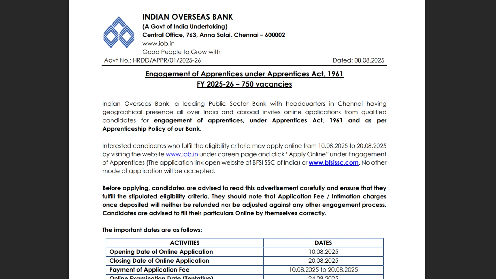 Indian Overseas Bank (IOB) Apprentice Recruitment 2025: The Indian Overseas Bank (IOB) has announced the recruitment of 750 Apprentices under the Apprentices Act, 1961, through an official notification issued on 8 August 2025.