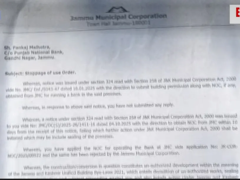 JMC seized Punjab National Bank Branch in Jammu
