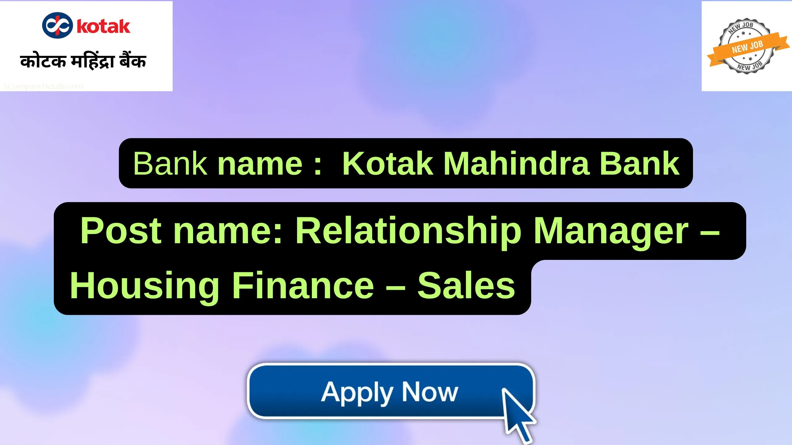 | Job Responsibilities: | Kotak Mahindra Bank Ltd. is looking for a highly motivated Relationship Manager to manage and expand business in the Housing Finance – Sales vertical through Direct Selling Agents (DSAs) and branch channels. This role focuses on driving mortgage product sales, ensuring process compliance, and managing end-to-end case processing with internal and external stakeholders. The ideal candidate will bring strong expertise in mortgage or housing loan sales, relationship management, and business development. |