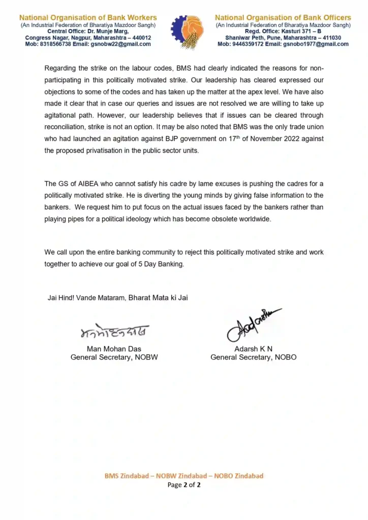 We, National Organisation of Bank Workers & National Organisation of Bank Officers had vide our letter dated 07/02/2026 had informed our members regarding non-participation of our organisation and our parent body Bhartiya Mazdoor Sangh in this purely motivated strike called on 12th of February 2026.