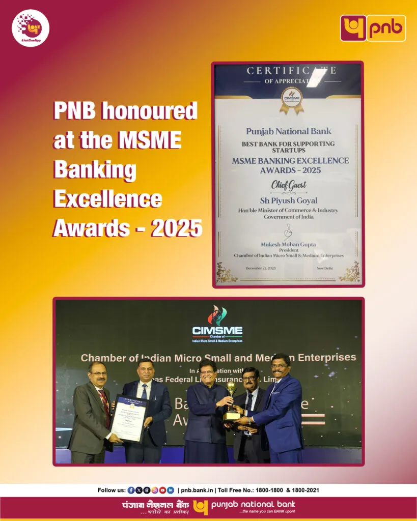 Punjab National Bank (PNB) has been honoured as the Best Bank for Supporting Start-Ups at the MSME Banking Excellence Awards 2025, recognising its strong contribution to nurturing India’s start-up ecosystem.