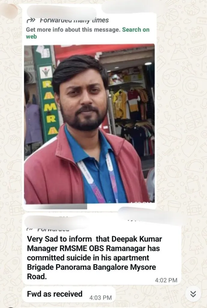A tragic incident has been reported from Bengaluru, where Deepak Kumar, Manager (RMSME, OBS Ramanagar), was found dead in his apartment at Brigade Panorama on Bangalore–Mysore Road.
