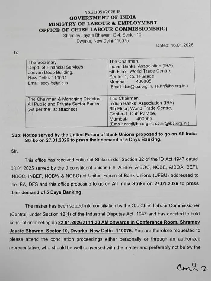 Earlier, a meeting was held between IBA and UFBU on 14.01.2026 to discuss on implementation of 5 Day Banking. The talks failed and UFBU announced to proceed on strike. Now, CLC has once again invited DFS and IBA Chairman to discuss on the issue of implementation of 5 Day Banking.