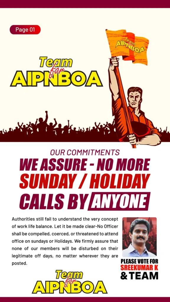 Team Sreekumar has released a strong manifesto related to the upcoming AIPNBOA Elections 2025-28. The elections are scheduled to be held on 23 November 2025. AIPNBOA President Sreekumar has promised to improve the work-life balance of employees, and the manifesto contains everything the officers desire.