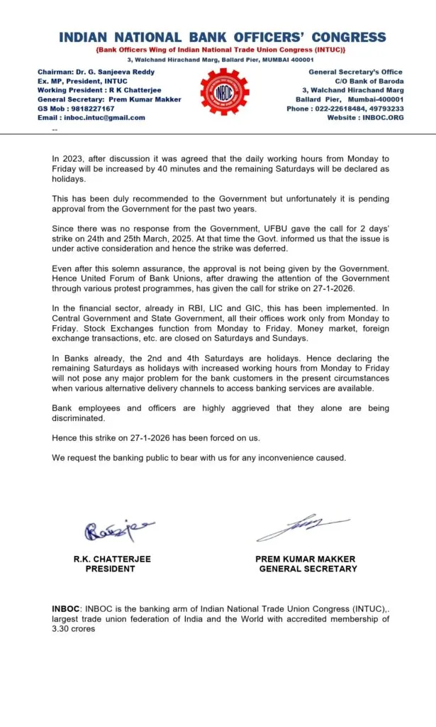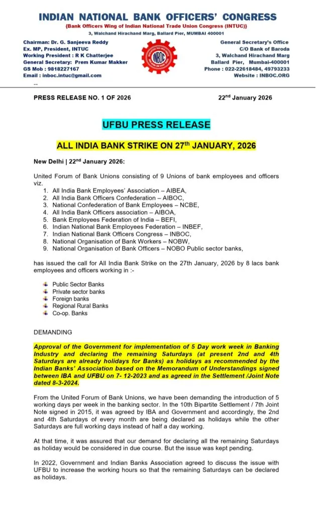 Hence United Forum of Bank Unions, after drawing the attention of the Government through various protest programmes, has given the call for strike on 27-1-2026.