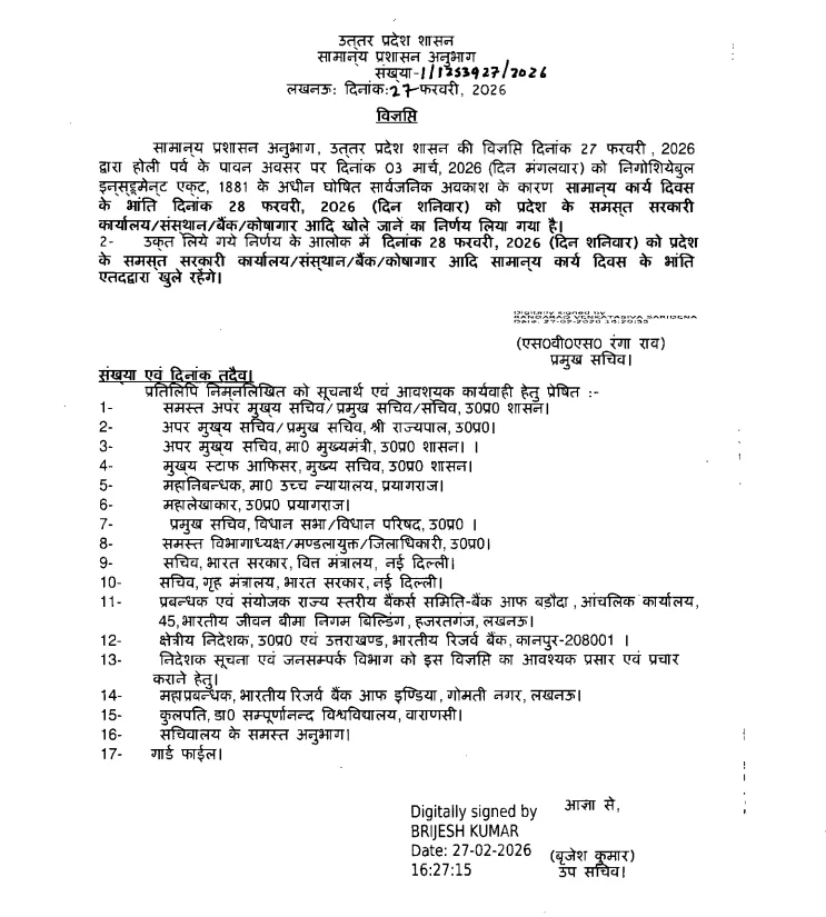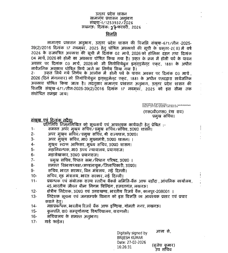 The Government of Uttar Pradesh has announced holiday on 3rd March 2026. Banks and all Govt offices will remain closed on 2nd, 3rd and 4th March 2026.