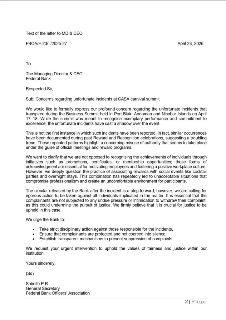 As per reports, the Bank’s Business Summit (Reward & Recognition Programme) was held at Port Blair, Andaman & Nicobar Islands, on 17th and 18th April 2026.