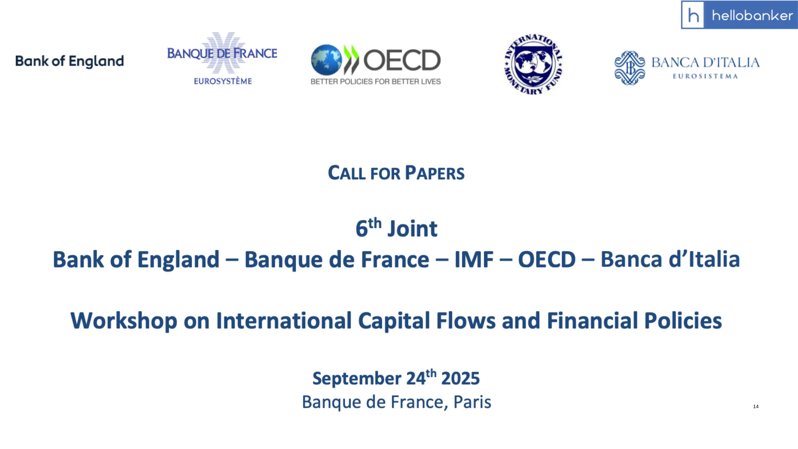The Bank of England, Banque de France, IMF, Banca d’Italia, and the OECD have announced a call for papers for the sixth annual workshop on International Capital Flows and Financial Policies. The workshop will be held on 24 September 2025 at the Banque de France in Paris.